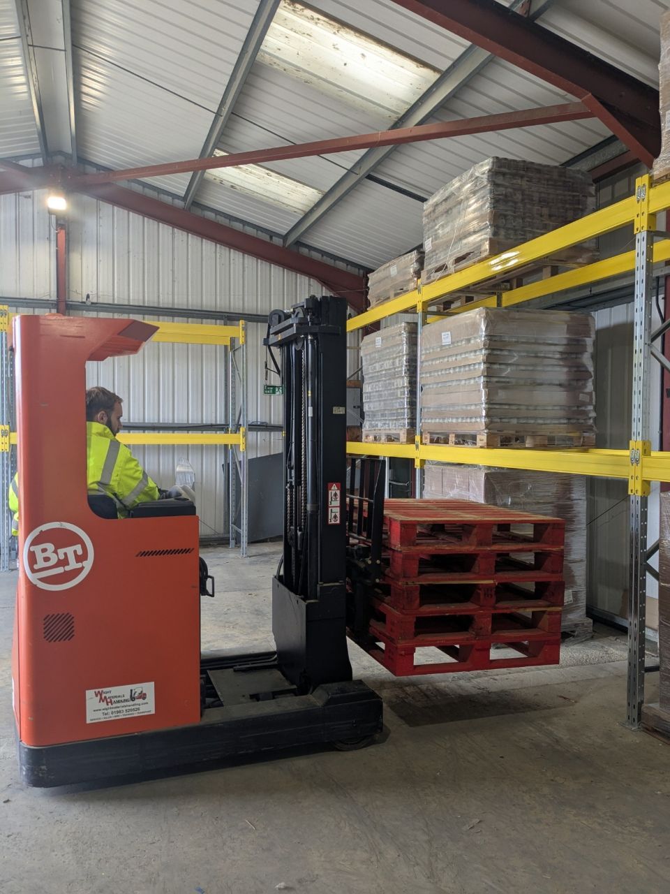 - Reach Truck (BT): Designed for tight indoor spaces and racking systems, the reach truck is engineered for maximum manoeuvrability. Its extended mast and ability to ‘reach’ into racking allow operators to stack high and deep with precision. Perfect for The Garlic Farm’s vertical pallet storage.